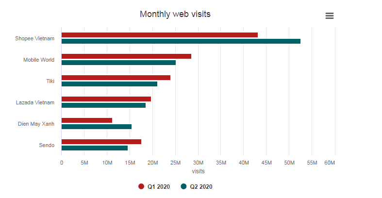 Số liệu của nền tảng mua sắm trực tuyến Singapore này vượt qua con số của hai công ty tiếp theo cộng lại với nhau, đó là Thế giới di động (25,1 triệu) và Tiki (21,1 triệu), theo dữ liệu được iPrice Group của Malaysia tổng hợp.